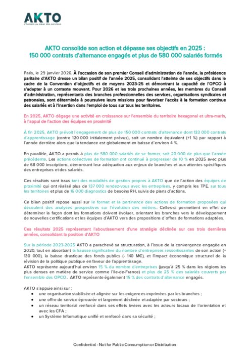 À l’occasion de son premier conseil d’administration de l’année, la présidence paritaire d’Akto dresse un bilan positif de l’année 2025, consolidant l’atteinte de ses objectifs dans le cadre de la Convention d’objectifs et de moyens 2023-25 et démontrant la capacité de l’Opco à s’adapter à un contexte mouvant. Pour 2026 et les trois prochaines années, les membres du Conseil d’administration, représentants des branches professionnelles des services, organisations syndicales et patronales, sont déterminés à poursuivre leurs missions pour favoriser