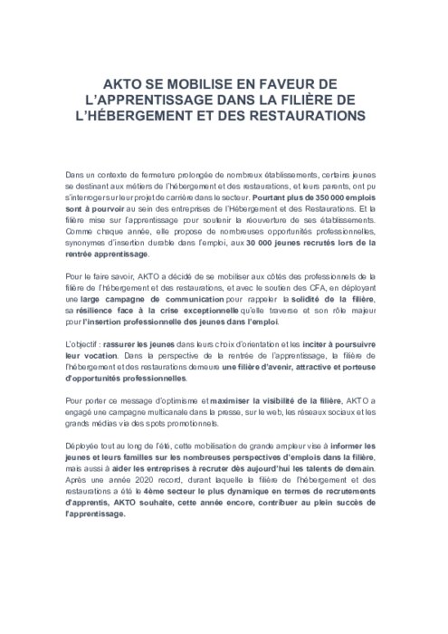 Alors que le secteur de l’hébergement et des restaurations a été fortement impacté par la crise, l’opérateur de compétences AKTO lance une vaste campagne de communication destinée à promouvoir les métiers de la filière auprès des jeunes, à quelques jours de la réouverture des établissements et quelques mois de la rentrée des futurs apprentis.