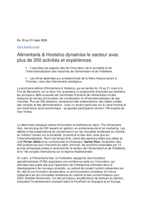 La prochaine édition d'Alimentaria et Hostelco, qui se tiendra du 18 au 21 mars à la Fira de Barcelone, sur la Gran Via, proposera un programme d'activités qui abordera les principaux défis auxquels est confrontée l'industrie de l'alimentation et des boissons en termes d'innovation, de numérisation et d'internationalisation de ses marchés. Plus de 350 sessions, comprenant des présentations, des tables rondes, des congrès et des démonstrations - avec un accent particulier sur le canal Horeca et son importance socio-économique - auxquelles participeront environ 700 experts de haut niveau.