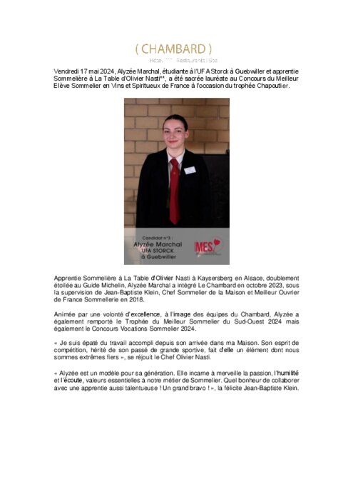Apprentie Sommelière à La Table d’Olivier Nasti à Kaysersberg en Alsace, doublement étoilée au Guide Michelin, Alyzée Marchal a intégré Le Chambard en octobre 2023, sous la supervision de Jean-Baptiste Klein, Chef Sommelier de la Maison et Meilleur Ouvrier de France Sommellerie en 2018.