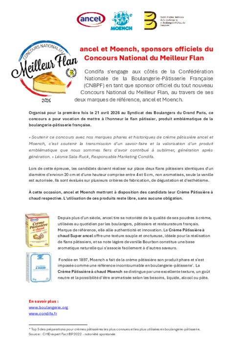 Condifa s'engage aux côtés de la Confédération Nationale de la Boulangerie-Pâtisserie Française (CNBPF) en tant que sponsor officiel du tout nouveau Concours National du Meilleur Flan, au travers de ses deux marques de référence, ancel et Moench.