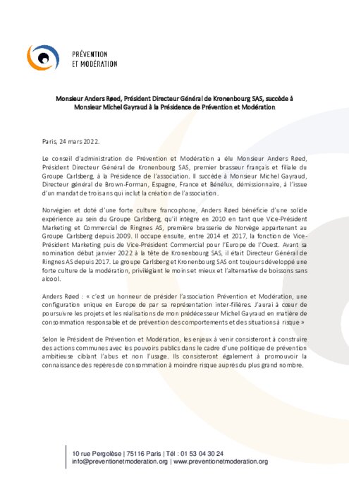 Le conseil d’administration de Prévention et Modération a élu Monsieur Anders Røed, Président Directeur Général de Kronenbourg SAS, premier brasseur français et filiale du Groupe Carlsberg, à la Présidence de l’association.