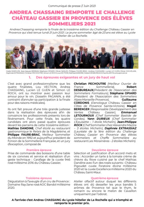 Lundi 21 juin 2021, s'est tenue la Finale du Challenge Château Gassier en Provence des élèves sommeliers. Andrea Chassaing, du Lycée hôtelier de La Rochelle, remporte la finale de cette troisième édition parrainée par Philippe Faure-Brac (Meilleur Sommelier du Monde 1992 et Président de l'Union de la Sommellerie Française) et Mathias Dandine (Chef étoilé du restaurant gastronomique Le Relais de la Magdeleine).
