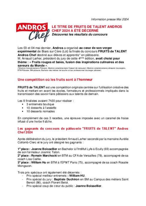 Les 03 et 04 mai, Andros a organisé au cœur de son verger expérimental de Biars sur Cère (Lot) la finale du concours Fruits de Talent Andros Chef destiné aux élèves et apprentis en pâtisserie.