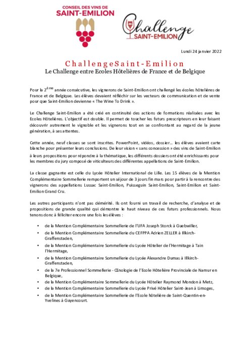 Pour la 2ème année consécutive, les vignerons de Saint-Emilion ont challengé les écoles hôtelières de France et de Belgique. Les élèves devaient réfléchir sur les vecteurs de communication et de vente pour que Saint-Emilion devienne « The Wine To Drink ».