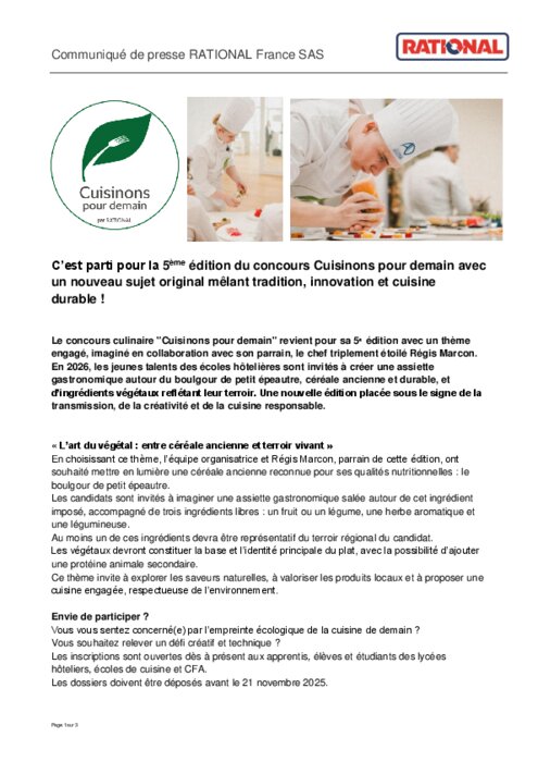 Le concours culinaire "Cuisinons pour demain" revient pour sa 5ᵉ édition avec un thème engagé, imaginé en collaboration avec son parrain, le chef triplement étoilé Régis Marcon. En 2026, les jeunes talents des écoles hôtelières sont invités à créer une assiette gastronomique autour du boulgour de petit épeautre, céréale ancienne et durable, et d’ingrédients végétaux reflétant leur terroir. Une nouvelle édition placée sous le signe de la transmission, de la créativité et de la cuisine responsable.