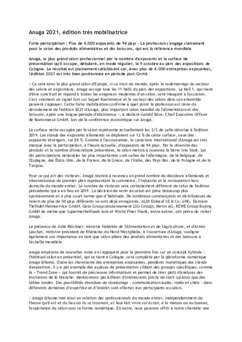 Métiers 14 septembre 2021 - 15:23 Forte participation : Plus de 4.000 exposants de 94 pays – La profession s'engage clairement pour le salon des produits alimentaires et des boissons, qui est la référence mondiale. PDF (102 Ko) Télécharger