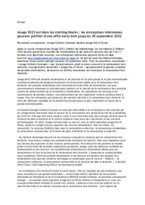 Après le succès remporté par Anuga 2021, édition de redémarrage, les inscriptions à l'édition 2023 du plus grand salon mondial de l'alimentation et des boissons qui aura lieu du 7 au 11 octobre sont désormais ouvertes.