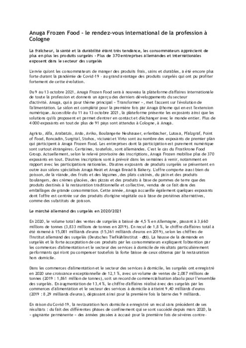 Métiers 09 septembre 2021 - 10:10 La fraîcheur, la santé et la durabilité étant très tendance, les consommateurs apprécient de plus en plus les produits surgelés - Plus de 370 entreprises allemandes et internationales exposent dans le secteur des surgelés PDF (110 Ko) Télécharger