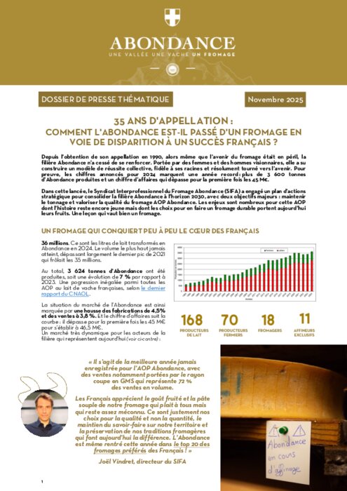 Depuis l’obtention de son appellation en 1990, alors même que l’avenir du fromage était en péril, la filière Abondance n’a cessé de se renforcer. Portée par des femmes et des hommes visionnaires, elle a su construire un modèle de réussite collective, fidèle à ses racines et résolument tourné vers l’avenir.