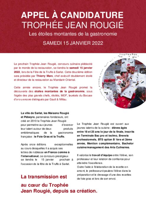 Métiers 07 septembre 2021 - 15:48 Le prochain Trophée Jean Rougié, concours culinaire plébiscité par le monde de la restauration, se tiendra le samedi 15 janvier 2022, lors de la Fête de la Truffe à Sarlat. PDF (470 Ko) Télécharger
