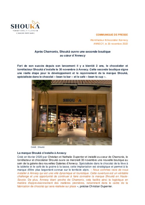 Fort de son succès depuis son lancement il y a bientôt 2 ans, le chocolatier et torréfacteur Shoukâ s’installe le 30 novembre à Annecy. Cette seconde boutique signe une réelle étape pour le développement et le rayonnement de la marque Shoukâ, spécialisée dans le chocolat « bean to bar » et le café « bean to cup ».