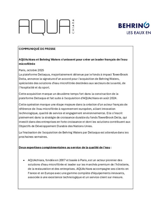 Cette opération marque une étape majeure dans la création d’un acteur français de référence de l’eau microfiltrée à rayonnement européen, alliant innovation technologique, qualité de service et engagement environnemental. Elle s’inscrit pleinement dans la stratégie de croissance durable du fonds TowerBrook Delta, qui investit dans des entreprises en forte croissance et dont les solutions contribuent aux Objectifs de Développement Durable des Nations Unies.