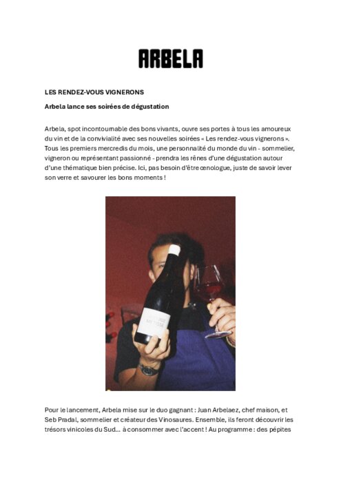 Arbela, spot incontournable des bons vivants, ouvre ses portes à tous les amoureux du vin et de la convivialité avec ses nouvelles soirées « Les rendez-vous vignerons ». Tous les premiers mercredis du mois, une personnalité du monde du vin - sommelier, vigneron ou représentant passionné - prendra les rênes d’une dégustation autour d’une thématique bien précise. Ici, pas besoin d’être œnologue, juste de savoir lever son verre et savourer les bons moments .