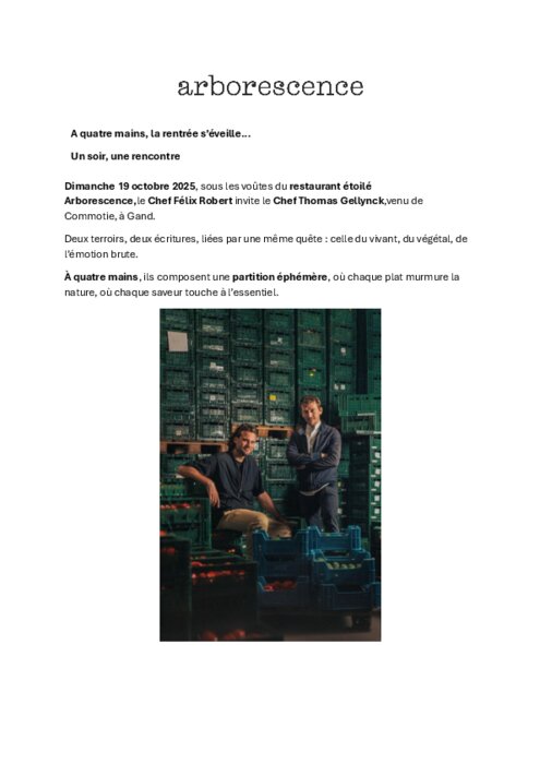 Dimanche 19 octobre, sous les voûtes du restaurant étoilé Arborescence, le chef Félix Robert invite le chef Thomas Gellynck, venu de Commotie, à Gand. Deux terroirs, deux écritures, liées par une même quête : celle du vivant, du végétal, de l’émotion brute. À quatre mains, ils composent une partition éphémère, où chaque plat murmure la nature, où chaque saveur touche à l’essentiel.