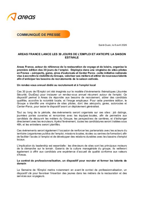 Areas France, acteur de référence de la restauration de voyage et de loisirs, organise la première édition des 30 jours de l’emploi. Déployée dans une vingtaine de sites pilotes en France – aéroports, gares, aires d’autoroute et Center Parcs - cette initiative nationale vise à accroître la visibilité du Groupe, valoriser ses métiers et attirer de nouveaux talents afin d’anticiper les besoins de recrutements de la saison estivale.