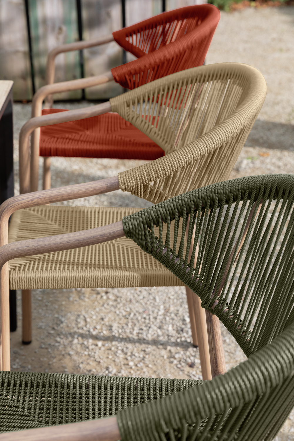 Arion est la nouvelle chaise d’extérieur qui conjugue avec finesse design contemporain et fonctionnalité. Sa structure en aluminium finition imitation bois offre une parfaite stabilité et apporte une touche chaleureuse et naturelle. L’assise est réalisée en tressage 100 % polyester, un matériau robuste et durable, décliné en trois coloris tendance — beige, kaki et terracotta — pensés pour se combiner harmonieusement. La chaise Arion ne craint ni les UV ni les intempéries. Elle sèche rapidement et conserve son allure saison après saison. Légère et empilable, elle se manipule aisément et se range facilement. Elle est idéale pour un usage en extérieur.