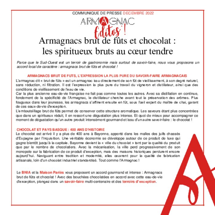 Fournisseurs 13 décembre 2022 - 15:43 Le Bureau National Interprofessionnel de l’Armagnac et la Maison Pariès proposent un accord gourmand et intense. PDF (335 Ko) Télécharger