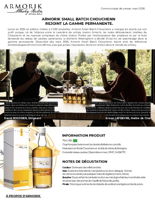 Lancé en 2025 en édition limitée à 2 500 bouteilles, Armorik Small Batch Chouchenn a marqué les esprits par son profil unique, né de l’alliance entre le caractère du whisky breton Armorik, les notes délicatement miellées du Chouchenn et les nuances complexes du chêne breton. Portée par l’enthousiasme des amateurs et par la forte demande du réseau de cavistes partenaires, la distillerie Warenghem a décidé d’inscrire cet assemblage dans la gamme permanente. Disponible dès mars 2026, Armorik Small Batch Chouchenn rejoint ainsi les références emblématiques d’Armorik et affirme, plus que jamais, l’expression du terroir breton dans le monde du whisky.