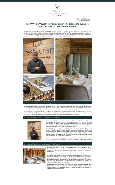 Niché au cœur du massif de l’Oisans, le V de Vaujany ouvre une nouvelle page de son histoire gastronomique avec l’arrivée du chef Simon Roullier, un talent instinctif au parcours singulier, porteur d’une vision culinaire moderne et profondément ancrée dans le terroir. Sa cuisine, à la fois méditerranéenne, végétale et intuitive, incarne la nouvelle identité gourmande du V, où l’émotion, la technique et le produit sont au centre de chaque assiette.