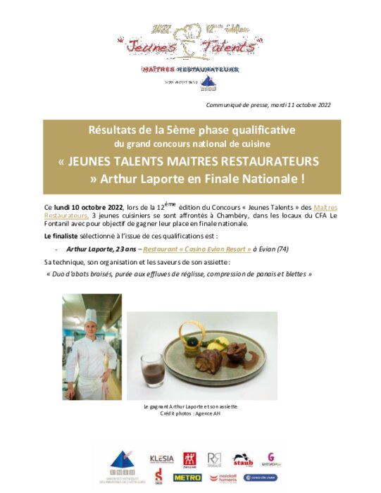 Métiers 11 octobre 2022 - 17:56 Ce lundi 10 octobre, lors de la 12ème édition du Concours « Jeunes Talents » des Maîtres Restaurateurs, 3 jeunes cuisiniers se sont affrontés à Chambéry, dans les locaux du CFA Le Fontanil avec pour objectif de gagner leur place en finale nationale. PDF (434 Ko) Télécharger
