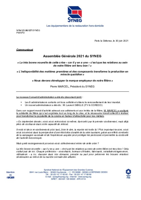 L’Assemblée Générale du SYNEG s’est réunie le 30 juin à la Maison de la mécanique (Paris la Défense) sous la Présidence de M. Pierre MARCEL, en présence des adhérents et des invités de la filière de la restauration hors-domicile & de la blanchisserie.