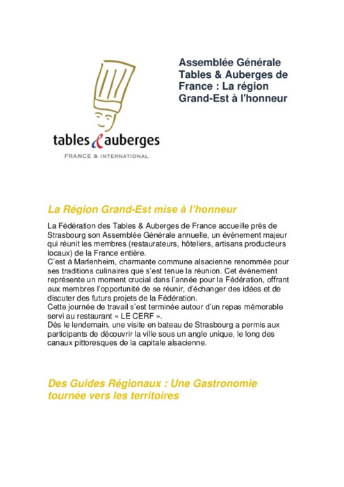 Métiers 08 novembre 2023 - 15:08 La Fédération des Tables & Auberges de France accueille près de Strasbourg son Assemblée Générale annuelle, un évènement majeur qui réunit les membres (restaurateurs, hôteliers, artisans producteurs locaux) de la France entière. PDF (199 Ko) Télécharger