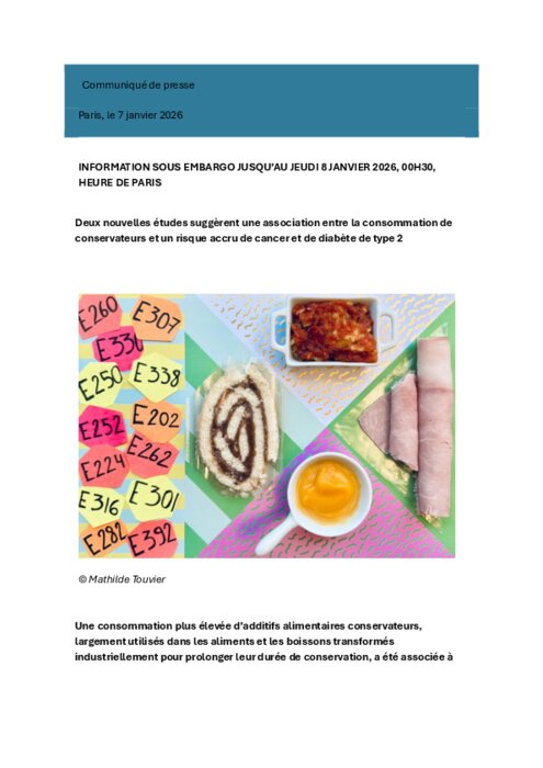 Une consommation plus élevée d’additifs alimentaires conservateurs, largement utilisés dans les aliments et les boissons transformés industriellement pour prolonger leur durée de conservation, a été associée à une augmentation du risque de cancer et de diabète de type 2. Ces résultats sont issus de travaux menés par des chercheurs et chercheuses de l’Inserm, d’INRAE, de l’Université Sorbonne Paris Nord, de l’Université Paris Cité et du Cnam, au sein de l’Équipe de recherche en épidémiologie nutritionnelle (Cress-Eren). Ils reposent sur les données de santé et de consommation alimentaire de plus de 100 000 adultes participants à l’étude de cohorte NutriNet-Santé. Ils font l’objet de deux publications distinctes : l’une dans The BMJ, l’autre dans la revue Nature Communications.