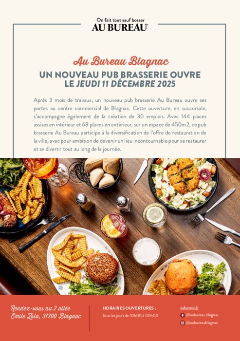 Après 3 mois de travaux, un nouveau pub brasserie Au Bureau ouvre ses portes, le jeudi 11 décembre, au sein du centre commercial de Blagnac. Cette ouverture, en succursale, s’accompagne également de la création de 30 emplois. Avec 144 places assises en intérieur et 68 places en extérieur, sur un espace de 450m2, ce pub brasserie Au Bureau participe à la diversification de l’offre de restauration de la ville, avec pour ambition de devenir un lieu incontournable pour se restaurer et se divertir tout au long de la journée.