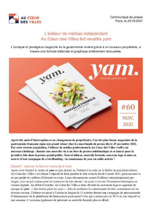 En seulement trois semaines, l'éditeur de médias indépendant Au Coeur des Villes (ACDV) vient de franchir les 100% du premier palier de sa campagne de crowdfunding Ulule, en vue de la renaissance de yam !