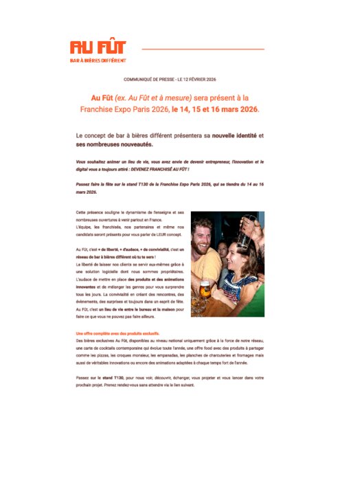 Cette présence souligne le dynamisme de l'enseigne et ses nombreuses ouvertures à venir partout en France. Des bières exclusives Au Fût, disponibles au niveau national uniquement grâce à la force de notre réseau, une carte de cocktails contemporaine qui évolue toute l'année, une offre food avec des produits à partager comme les pizzas, les croques monsieur, les empanadas, les planches de charcuteries et fromages mais aussi de véritables innovations ou encore des animations adaptées à chaque temps fort de l'année.
