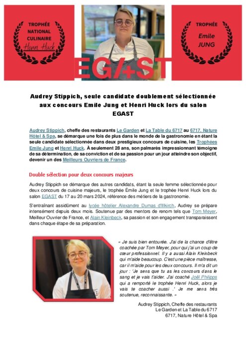 Audrey Stippich, cheffe des restaurants Le Garden et La Table du 6717 au 6717, Nature Hôtel et Spa, se démarque une fois de plus dans le monde de la gastronomie en étant la seule candidate sélectionnée dans deux prestigieux concours de cuisine, les Trophées Emile Jung et Henri Huck. À seulement 28 ans, son palmarès impressionnant témoigne de sa détermination, de sa conviction et de sa passion pour un jour atteindre son objectif, devenir un des Meilleurs Ouvriers de France.