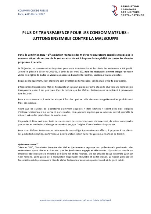 Métiers 03 février 2022 - 11:05 L’Association Française des Maîtres Restaurateurs accueille avec plaisir le nouveau décret du secteur de la restauration visant à imposer la traçabilité de toutes les viandes proposées à la carte. PDF (204 Ko) Télécharger
