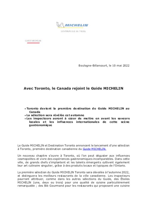 Métiers 10 mai 2022 - 17:07 Toronto devient la première destination du Guide MICHELIN au Canada. PDF (139 Ko) Télécharger