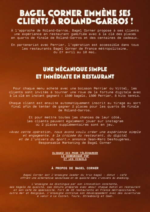 Snacking 20 avril 2026 - 14:41 A l’approche de Roland-Garros, Bagel Corner propose à ses clients une expérience en restaurant gamifiée avec à la clé des places en quarts de finale de Roland-Garros et des centaines de cadeaux. PDF (214 Ko) Télécharger