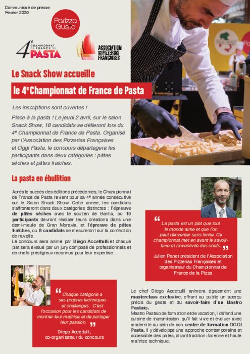 Après le succès des éditions précédentes, le Championnat de France de Pasta revient pour sa 4ᵉ année consécutive sur le Salon Snack Show. Cette année, les candidats s’affronteront dans deux catégories distinctes : l’épreuve de pâtes sèches avec le soutien de Barilla, où 10 participants devront réaliser leurs créations dans une demi-meule de Gran Moravia, et l’épreuve de pâtes fraîches, où 8 candidats se mesureront sur la confection de raviolis. Le concours sera animé par Diego Accettulli et chaque plat sera évalué par un jury composé de professionnels et de chefs prestigieux reconnus pour leur expertise.