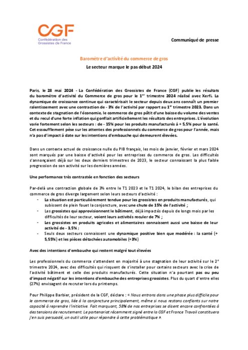 La Confédération des Grossistes de France (CGF) publie les résultats du baromètre d’activité du Commerce de gros pour le 1er trimestre 2024 réalisé avec Xerfi. La dynamique de croissance continue qui caractérisait le secteur depuis deux ans connaît un premier ralentissement avec une contraction de - 3% de l’activité par rapport au 1er trimestre 2023.