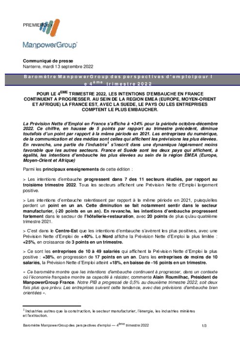 Métiers 13 septembre 2022 - 07:01 Au sein de la région EMEA (Europe, Moyen-Orient et Afrique), la Suède et la France se classent en tête des intentions d'embauche, avec une Prévision Nette d'Emploi de +34%, en hausse de 5 points par rapport au trimestre précédent. PDF (236 Ko) Télécharger