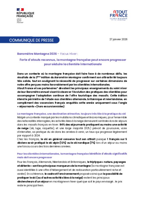 Dans un contexte où la montagne française doit faire face à de nombreux défis, les résultats de la 2ème édition du Baromètre Montagne confirment son attractivité toujours très solide, tout en soulignant la nécessité de progresser sur certaines dimensions de notre offre perçues moins favorablement par les clientèles internationales.