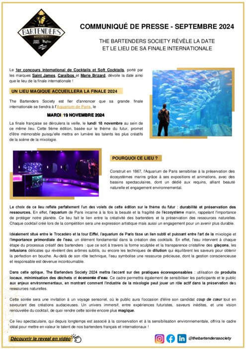 The Bartenders Society est fier d'annoncer que sa grande finale internationale se tiendra à l’Aquarium de Paris, le mardi 19 novembre . La finale française se déroulera la veille, le lundi 18 novembre au sein de ce même lieu. Cette 9e édition, basée sur le thème du futur, promet d'être mémorable puisqu'elle mettra en lumière les talents les plus créatifs de la scène de la mixologie.