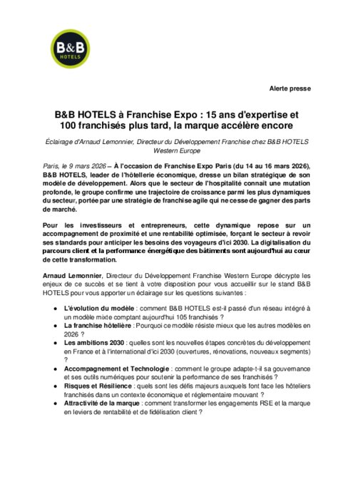 À l'occasion de Franchise Expo Paris (du 14 au 16 mars ), B&B Hotels, leader de l'hôtellerie économique, dresse un bilan stratégique de son modèle de développement. Alors que le secteur de l'hospitalité connaît une mutation profonde, le groupe confirme une trajectoire de croissance parmi les plus dynamiques du secteur, portée par une stratégie de franchise agile qui ne cesse de gagner des parts de marché.