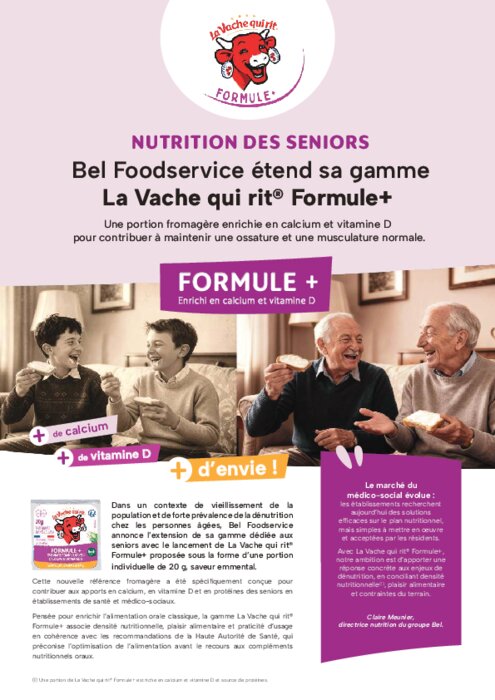 Dans un contexte de vieillissement de la population et de forte prévalence de la dénutrition chez les personnes âgées, Bel Foodservice annonce l’extension de sa gamme dédiée aux seniors avec le lancement de La Vache qui rit Formule+ proposée sous la forme d’une portion individuelle de 20 g, saveur emmental.