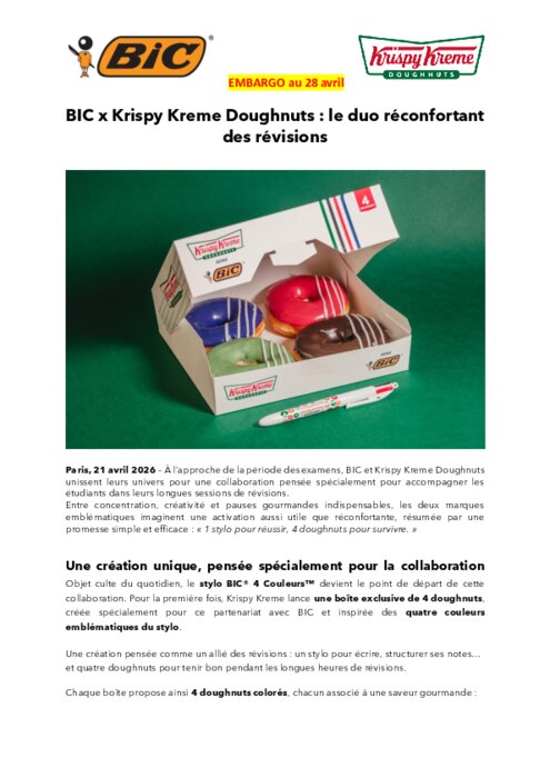 Le mythique stylo BIC 4 Couleurs inspire une création gourmande inédite disponible à partir du 28 avril 2026 : une boîte exclusive de 4 doughnuts aux couleurs emblématiques du stylo, associant plaisir et concentration dans un duo parfaitement équilibré.
