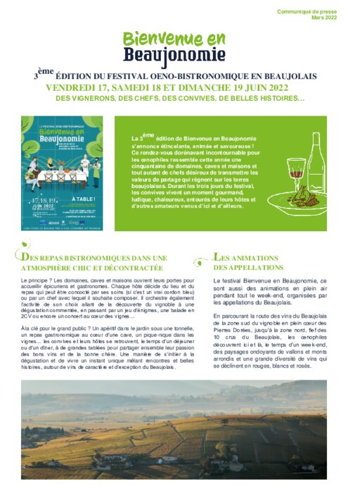 Métiers 10 mars 2022 - 09:45 La 3ème édition de Bienvenue en Beaujonomie s’annonce étincelante, animée et savoureuse . PDF (495 Ko) Télécharger