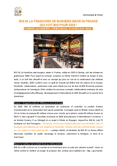 BiG M, la franchise des burgers made in France, créée en 2019 à Bondy, voit les choses en grand pour 2026. Pour rappel du concept : proposer au même endroit le meilleur du burger, le tout, halal, à un tarif très attractif et avec un concept qui joue sur l’art de la combinaison (les célèbres menus doublés).