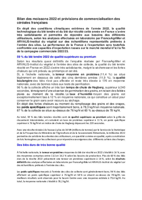 En dépit des conditions climatiques extrêmes de l’année 2022, la qualité technologique du blé tendre et du blé dur récolté cette année en France s’avère très satisfaisante et permettra de répondre aux besoins des différents utilisateurs, selon les analyses effectuées en laboratoire par FranceAgriMer et ARVALIS-Institut du végétal sur des échantillons représentatifs prélevés à l’entrée des silos.