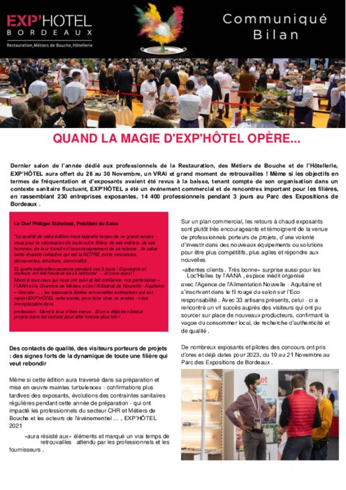 Métiers 15 décembre 2021 - 10:51 L’effervescence et la Ola des spectateurs venus soutenir les 121 candidats aux 12 concours et 108 membres du jury prestigieux, viennent cristalliser ces chaleureuses retrouvailles . PDF (560 Ko) Télécharger