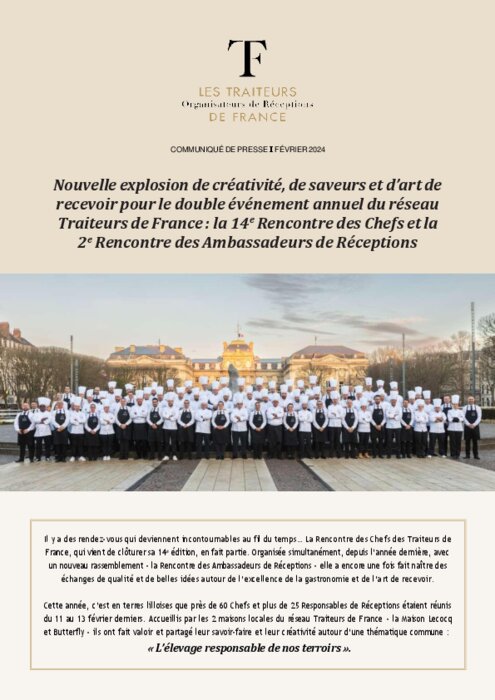 Cette année, c’est en terres lilloises que près de 60 Chefs et plus de 25 Responsables de Réceptions étaient réunis du 11 au 13 février . Accueillis par les 2 maisons locales du réseau Traiteurs de France – la Maison Lecocq et Butterfly - ils ont fait valoir et partagé leur savoir-faire et leur créativité autour d’une thématique commune : « L’élevage responsable de nos terroirs ».