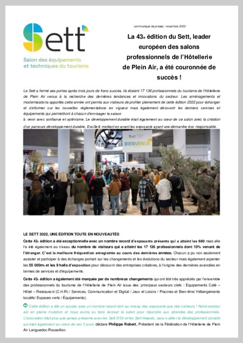 Le SETT a fermé ses portes après trois jours de franc succès. Ils étaient 17 136 professionnels du tourisme de l’Hôtellerie de Plein Air venus à la recherche des dernières tendances et innovations du secteur.