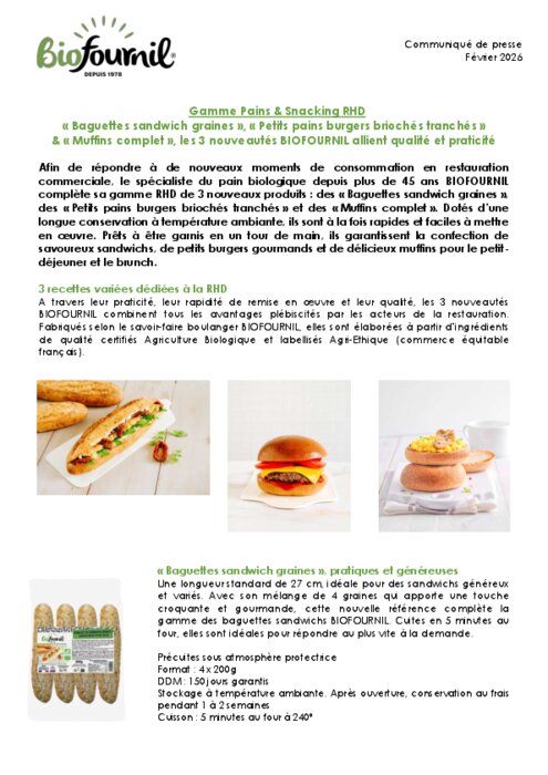Afin de répondre à de nouveaux moments de consommation en restauration commerciale, le spécialiste du pain biologique depuis plus de 45 ans Biofournil complète sa gamme RHD de 3 nouveaux produits : des « Baguettes sandwich graines », des « Petits pains burgers briochés tranchés » et des « Muffins complet ». Dotés d’une longue conservation à température ambiante, ils sont à la fois rapides et faciles à mettre en oeuvre. Prêts à être garnis en un tour de main, ils garantissent la confection de savoureux sandwichs, de petits burgers gourmands et de délicieux muffins pour le petit-déjeuner et le brunch.
